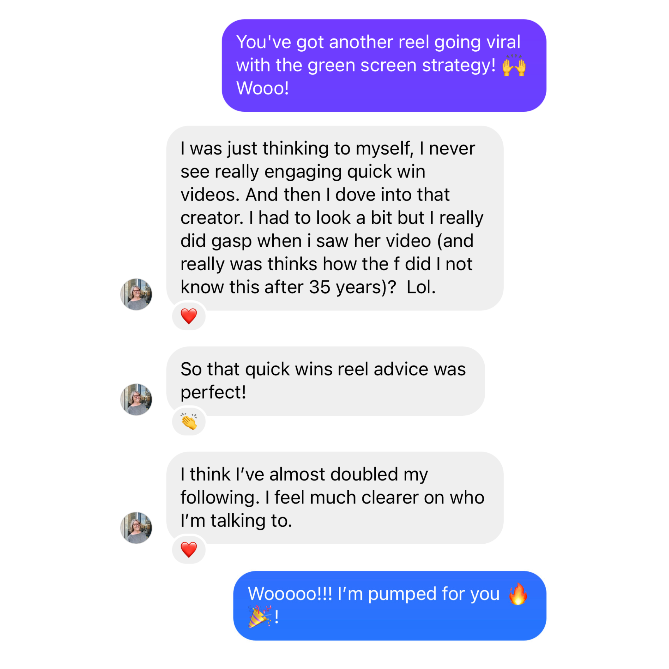 đNicole got busy implementing my most potent strategies, like the ones inside The Viral Views Injection Methodâ˘Â and the Reels Domination Systemâ˘Â to start hitting viral reels, from the get go đĽâŹď¸.Â