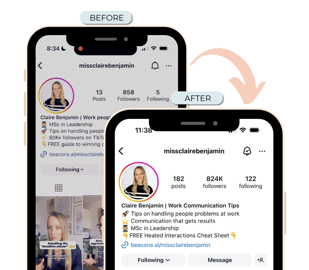 Iâve grown my own audiences to 1M+ on IG (in just over a year), 300K on TikTok, and my email list to 100K subscribers, all organically (not a single ad or boosted post), using the strategies I'm sharing inside the Inner Circle.