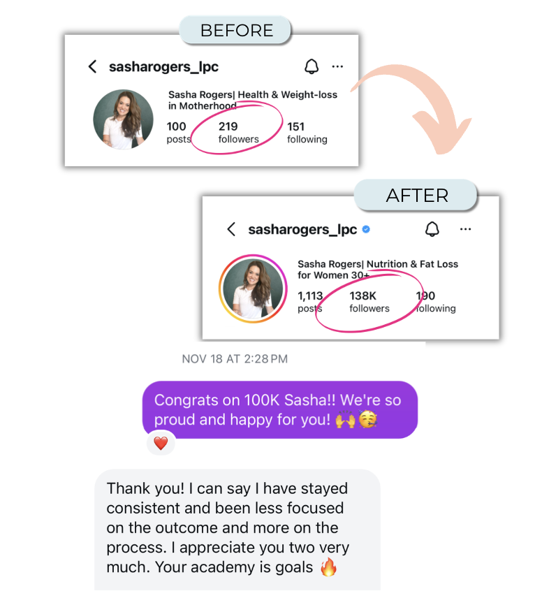👆Pace started at about 200 followers, and in 1 year she's gained 103K followers using my Master Key Messaging Formulas™, Content Banking System™ and creating her own Viral Content Menu™ (just to name a few).