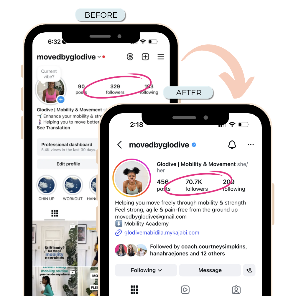 👆Glodive started the program at 300 followers. After following my 7 Figure Audience Empire Program strategies, and getting feedback on her reels in our coaching and content review sessions, she has now been consistently growing her account 100+ followers a day for 3 months, and is about to hit 20K followers after 6 months 🔥👇.